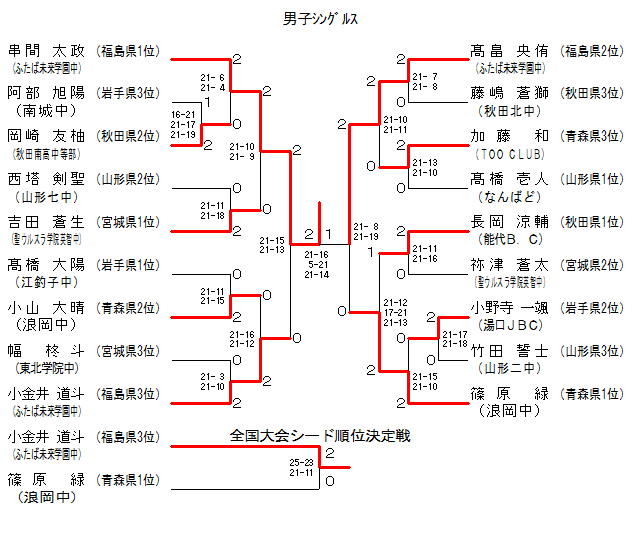 | BS-15 | ふたば未来学園中[福島県1位] | 串間 太政 | 2 | 21-15 21-13 | 0 | 小金井道斗 | ふたば未来学園中[福島県3位] | |